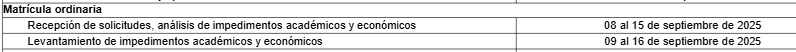 FECHAS PARA LEVANTAMIENTO DE IMPEDIMIENTOS ACADÉMICOS O ECONÓMICOS